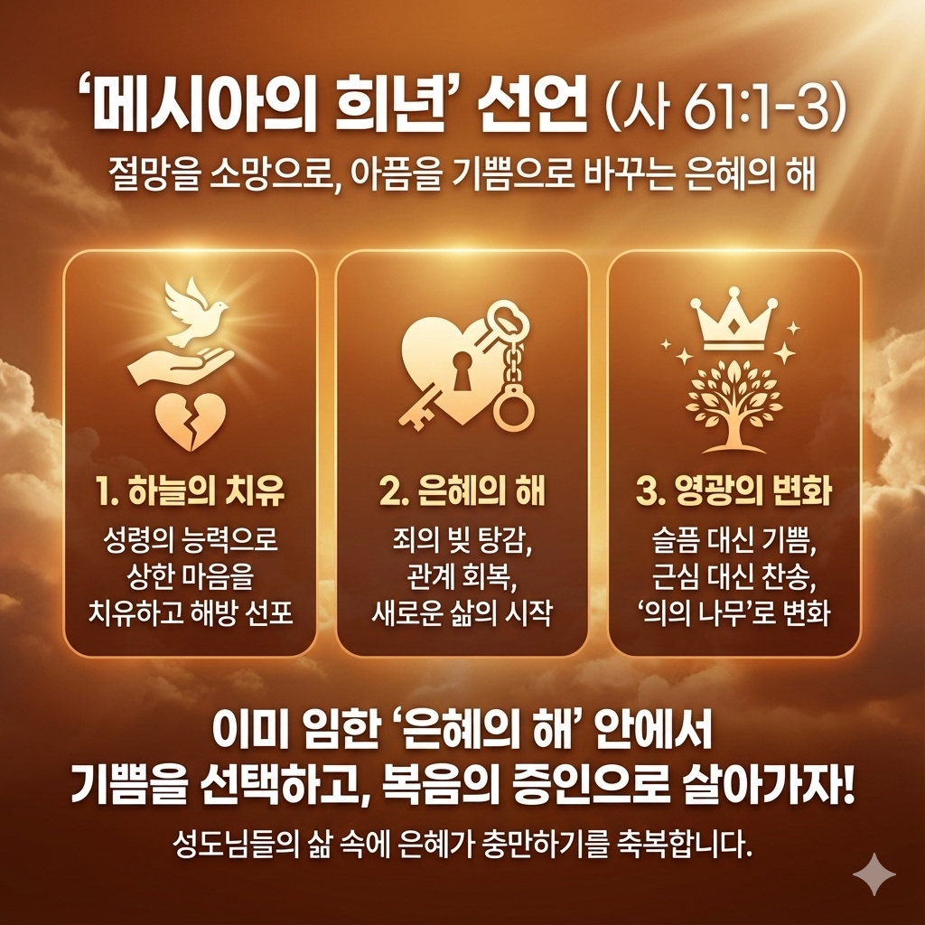 (결론) 우리는 이미 ‘은혜의 해’ 안에 살아가고 있는 사람들입니다. 주님께서 바꾸어주신 기쁨을 선택하고, 받은 은혜를 이웃에게 전하며, 상한 영혼을 살리는 복음의 증인으로 서야 합니다(행 1:8). 주님은 우리의 해방자이자 치료자이며, 참된 기쁨의 근원이십니다(히 5:9). 이 은혜가 성도님들의 삶 속에 충만히 임하시기를 축복합니다.