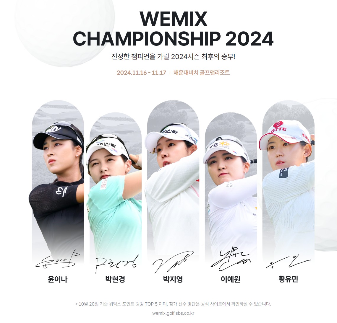 2024년 11월 16일(토)부터 17일(일)까지 해운대비치 골프앤리조트에서 개최됩니다. - 총 24명의 선수가 출전하며, 위믹스 포인트 랭킹 상위 20명과 추천 선수 4명이 참가합니다.