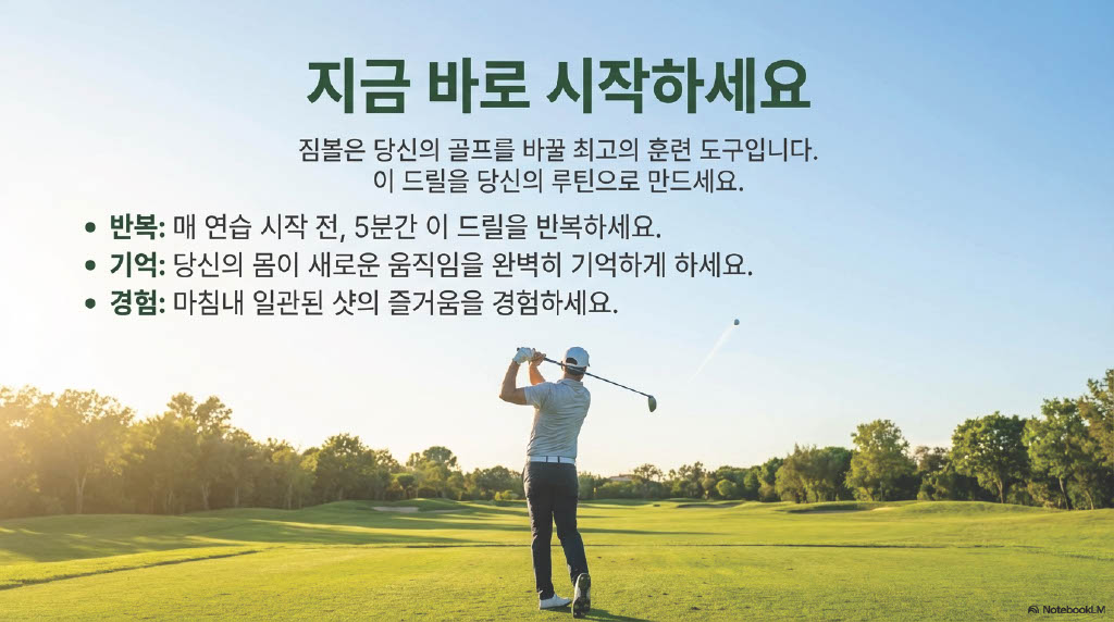 결과적으로 이 훈련은 중심축이 고정된 백스윙을 유도하여 스윙 궤도를 개선할 뿐만 아니라, 척추의 부담을 덜어주어 부상 방지와 정교한 볼 스트라이킹을 동시에 달성하도록 돕습니다.