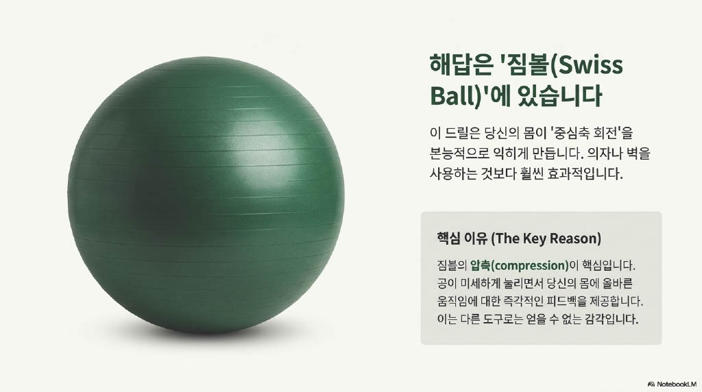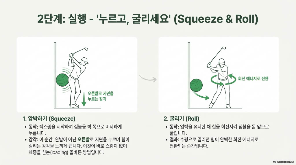 저자는 벽과 골반 사이에 짐볼을 활용한 드릴을 소개하며, 공을 벽 쪽으로 살짝 누르며 앞으로 굴리는 동작을 통해 상체와 하체의 유기적인 꼬임을 만들어내는 구체적인 방법을 제시합니다.