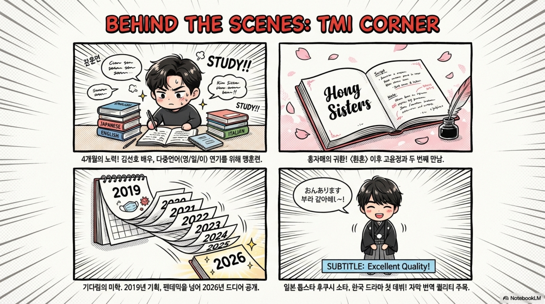 Q. 이 드라마 언제부터 준비한 거예요? → 놀랍게도 2019년부터 기획됐대요. 코로나 터지면서 제작 중단됐다가 2023년에 다시 살아났고, 2026년 1월에야 공개!