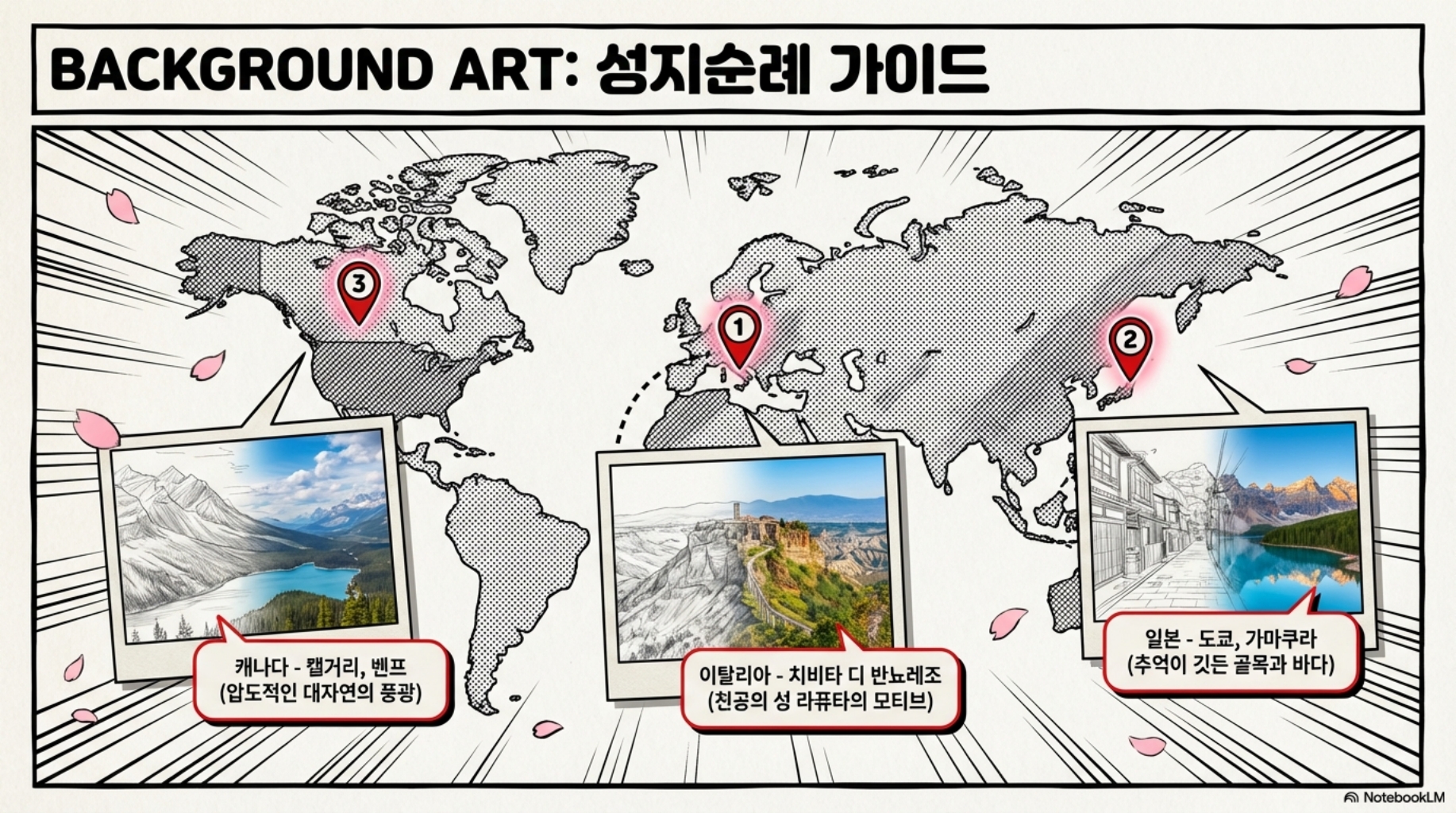 Q. 해외 촬영 어디서 했어요? → 한국은 기본이고요, 🇮🇹 이탈리아 (치비타 디 반뇨레조) 🇯🇵 일본 (도쿄, 가마쿠라) 🇨🇦 캐나다 (캘거리, 밴프, 드럼헬러)