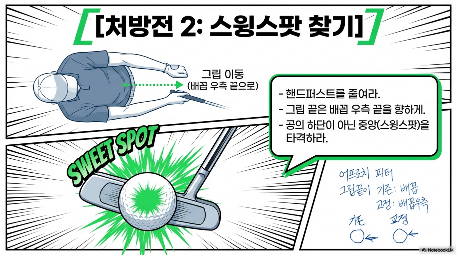 ✅ 교정: 그립 끝을 배꼽 우측 끝으로! → 로프트각/라이각 최적화 → 공 중앙 타격 성공