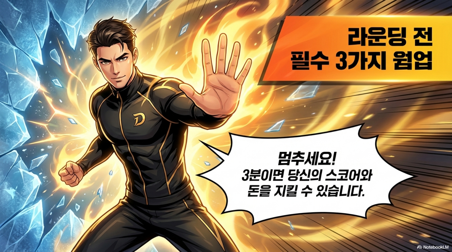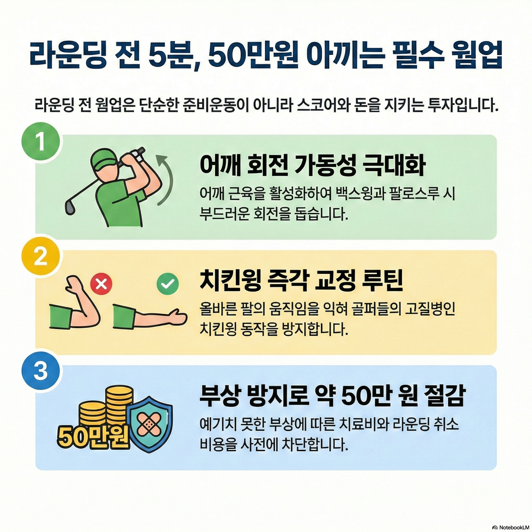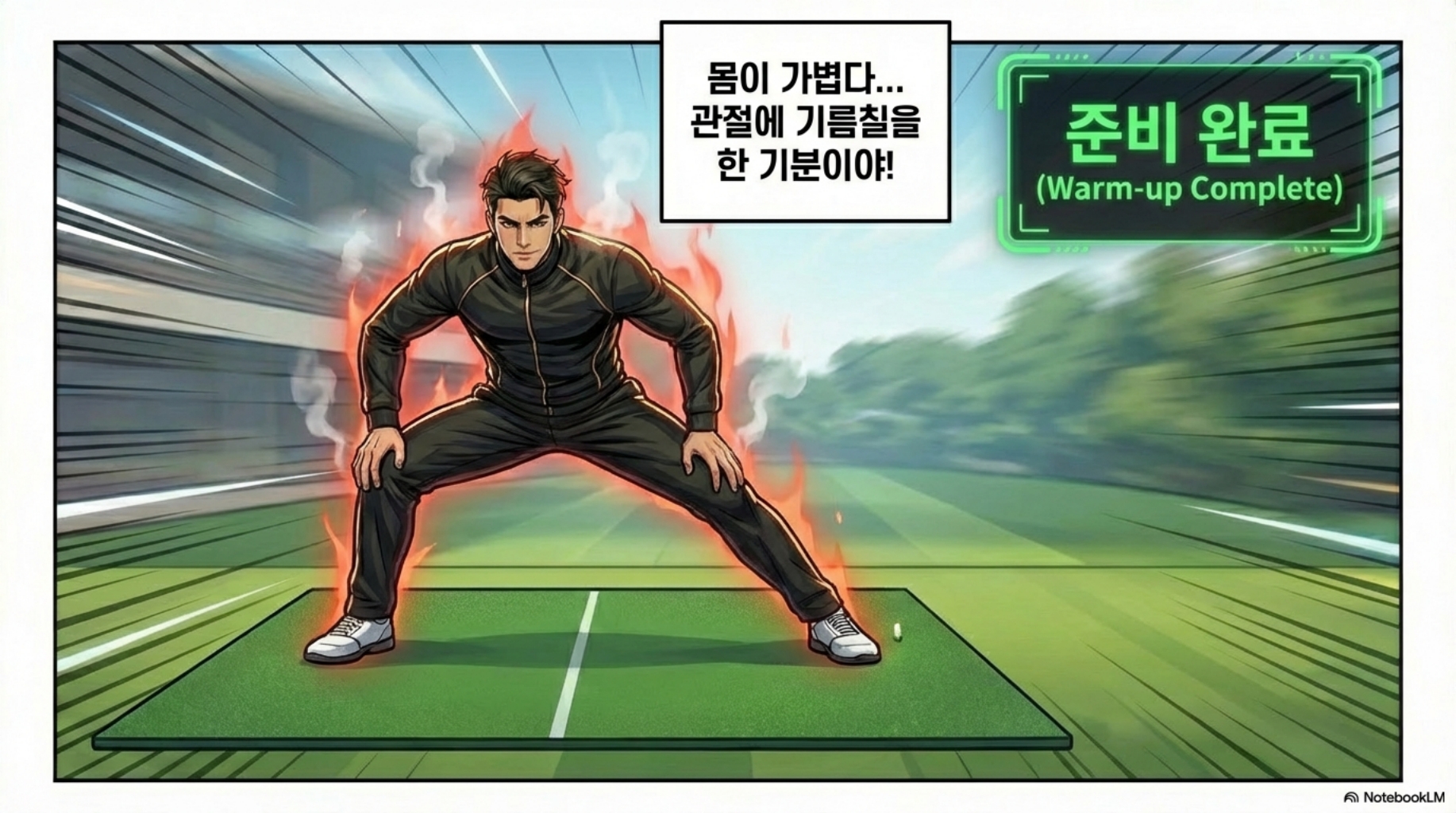 웜업 없이 첫 3홀 망치면? → 산술적으로 8만원 이상 허공에 날림 → 자신감 하락으로 전체 라운딩 만족도 ↓ → 부상 위험으로 치료비 수백만원 위험 ⚠️