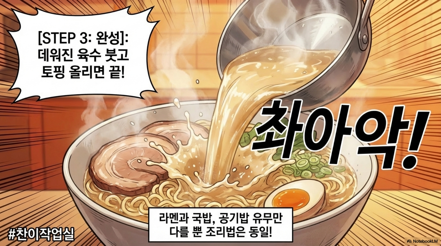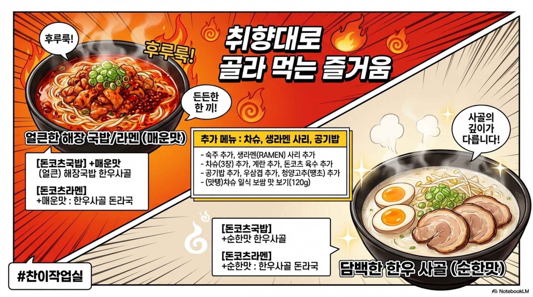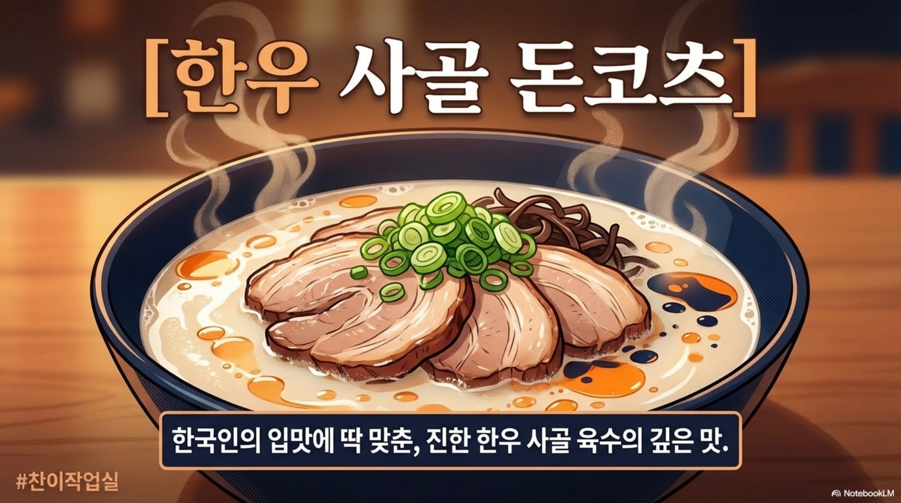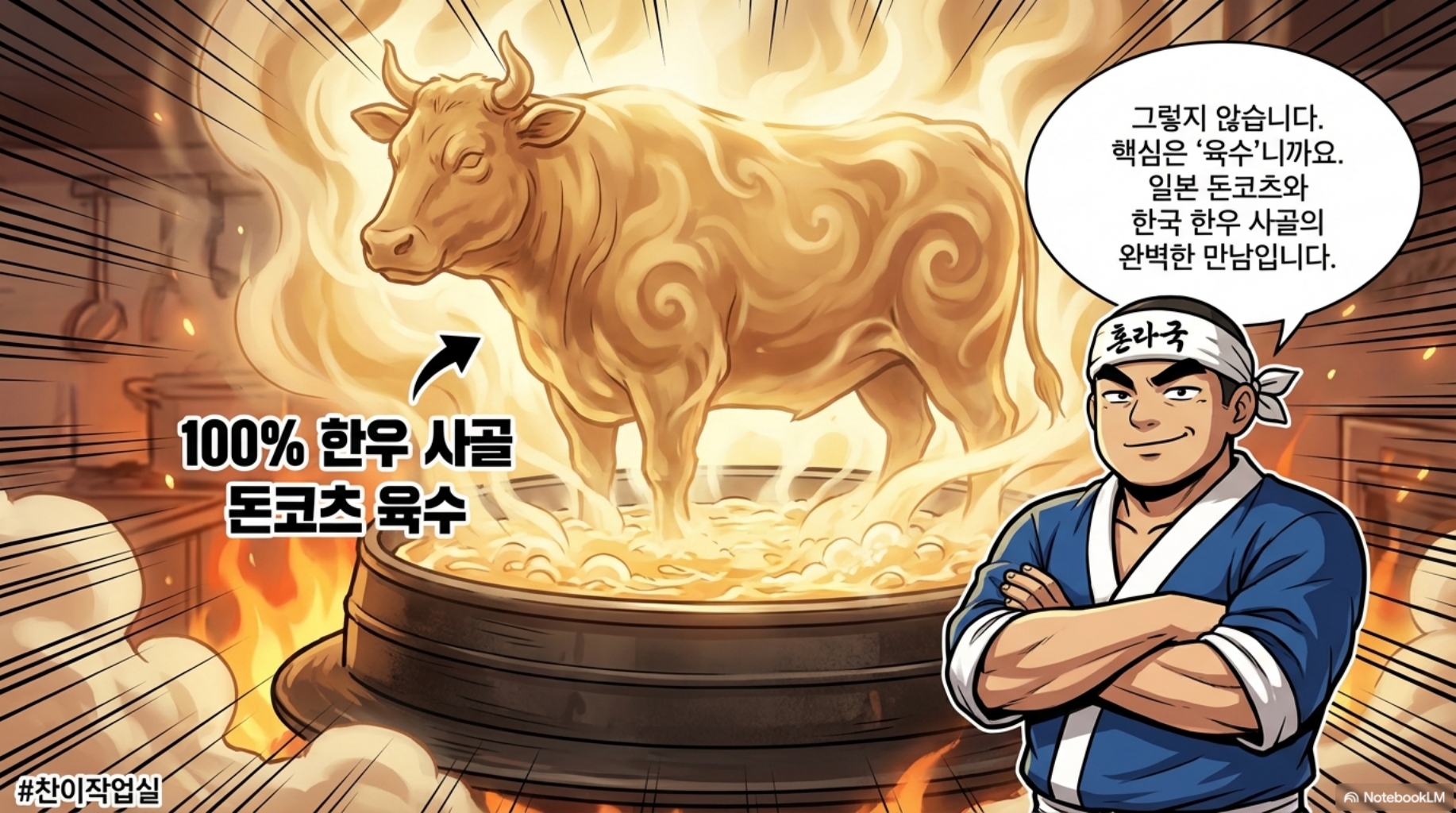 ▶ 일본 돈코츠의 진한 맛 ▶ 한국인이 사랑하는 한우 사골 육수 ▶ 이 둘을 섞으니까 = 누구나 좋아하는 맛!