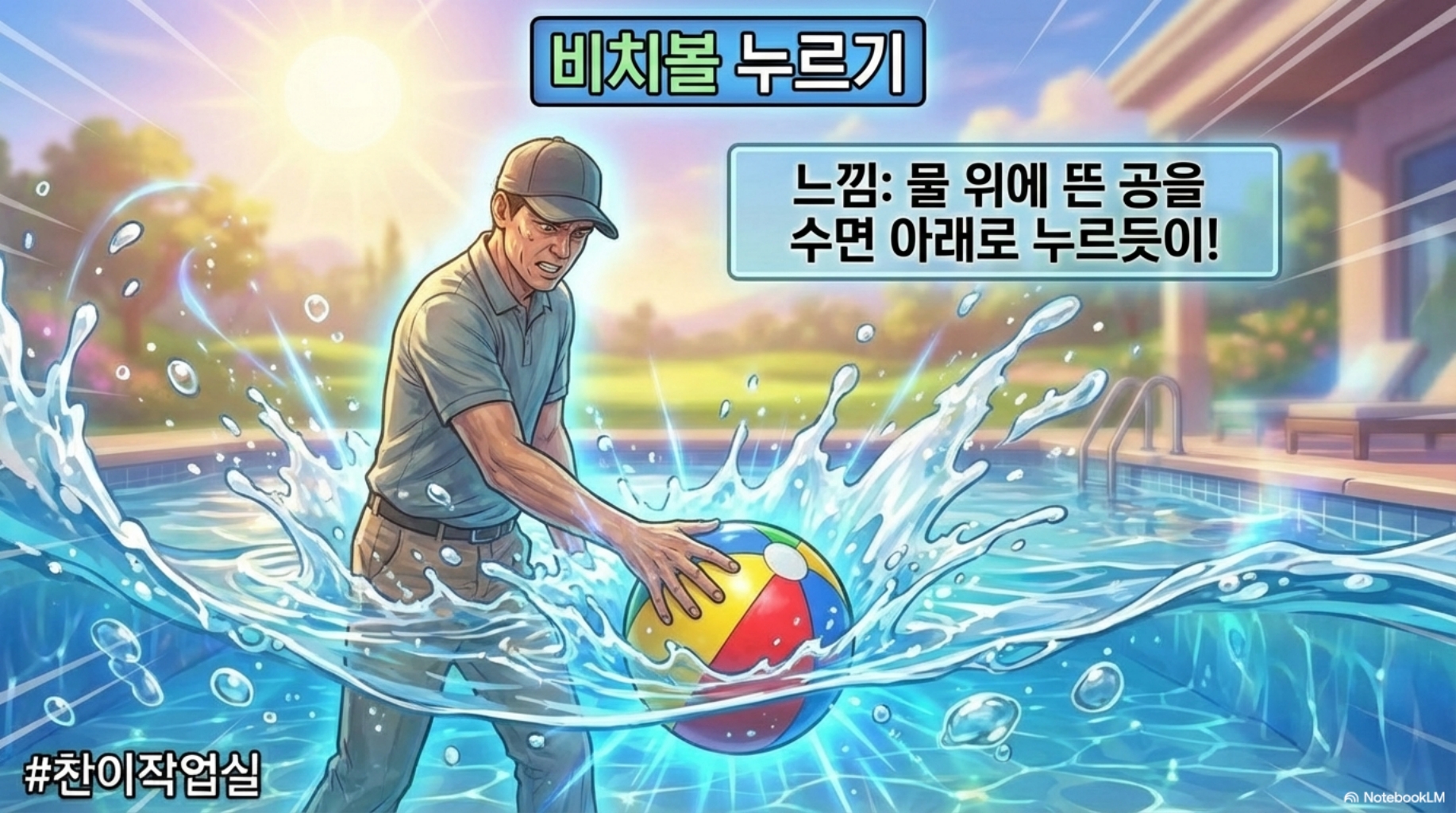 ③ 지레 작동 → 왼팔을 뒤로 밀면서 동시에 왼손바닥으로 그립 끝을 아래로 누르기 → 느낌은 비치볼을 물속으로 밀어넣는 저항감!
