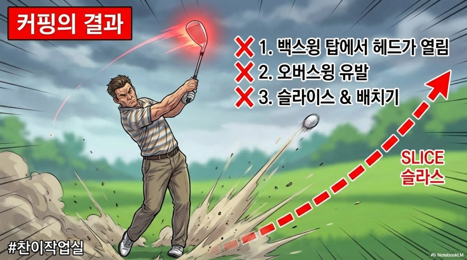 ✘ 백스윙 탑에서 페이스 오픈 ✘ 몸과 팔 일체감 붕괴 → 오버스윙 ✘ 다운스윙에서 보상 동작 → 엎어치기, 배치기 발생 ✘ 임팩트 일관성 완전히 파괴