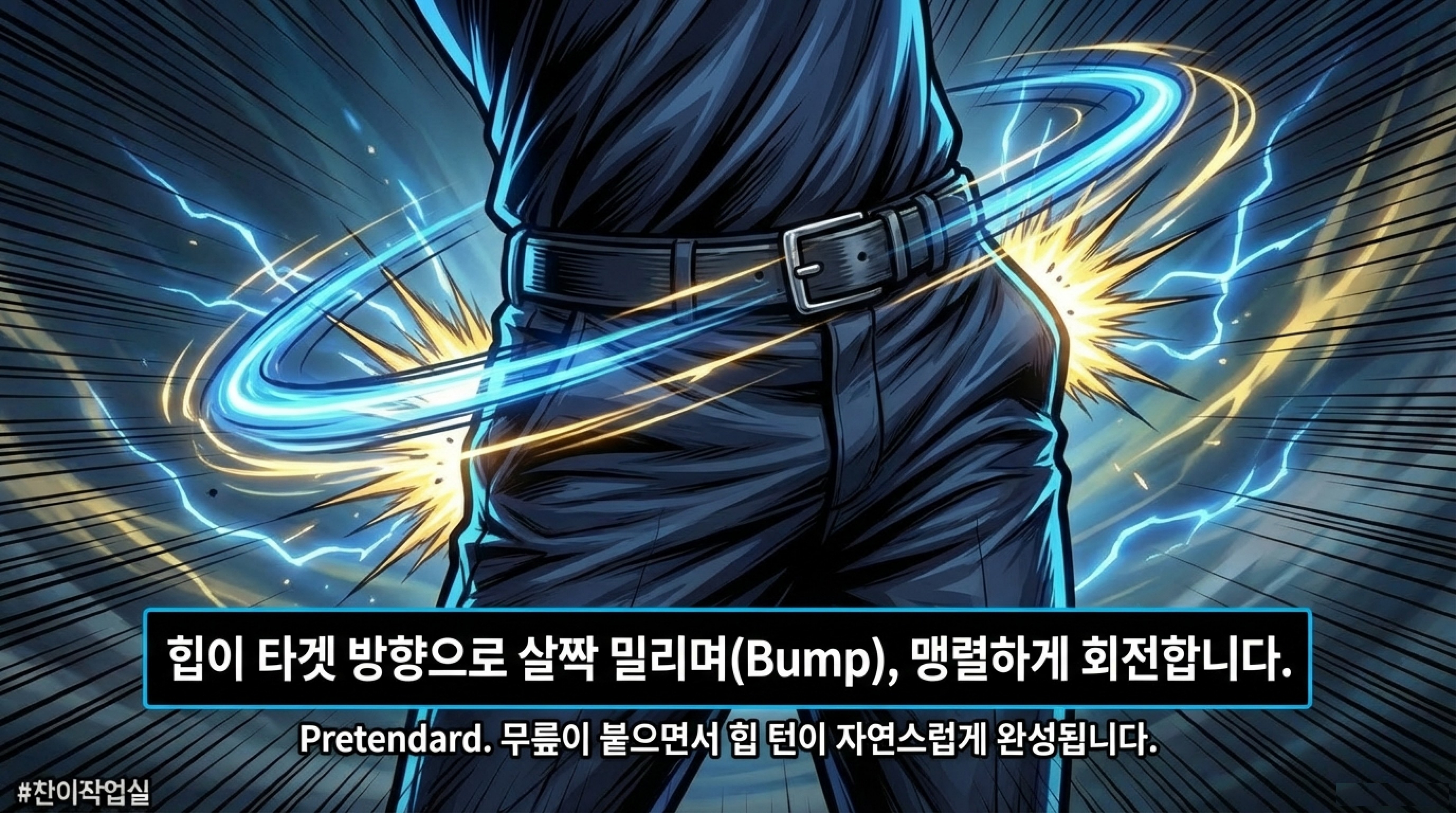 장전은 끝났는데 풀 수가 없으면 소용없죠. 많은 분들이 다운스윙 때 오른쪽 다리를 고정하려 하는데 이게 오히려 힙턴을 막아서 슬라이스를 만듭니다.