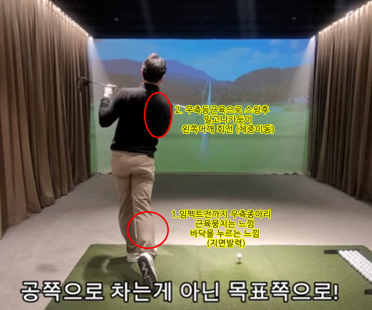 오른쪽 등근육으로 스윙후 왼쪽어깨를 열어주며